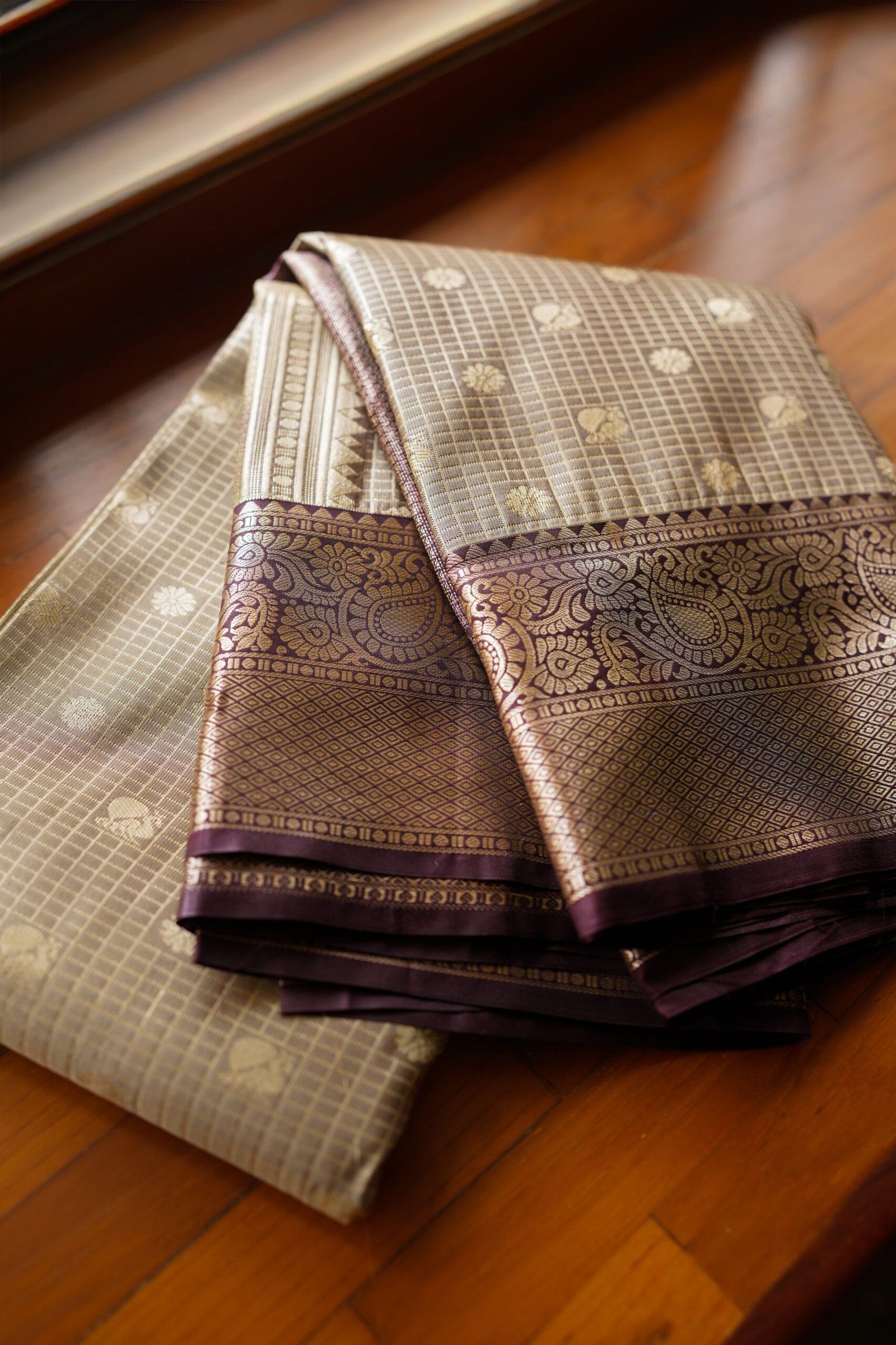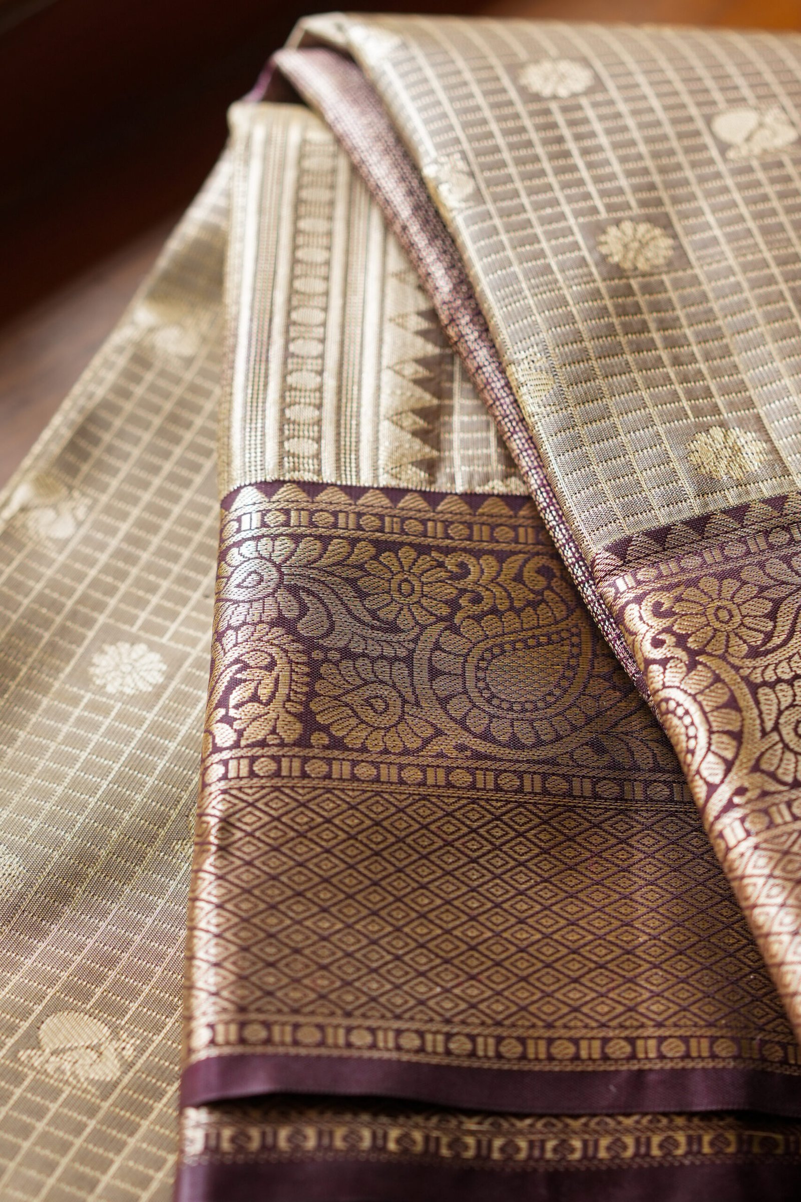 Semi Kanchipuram saree with a full elegent golden stripes, beautifully woven to showcase rich patterns and elegant texture. Crafted for a luxurious look with a lightweight feel, it blends traditional charm with modern comfort