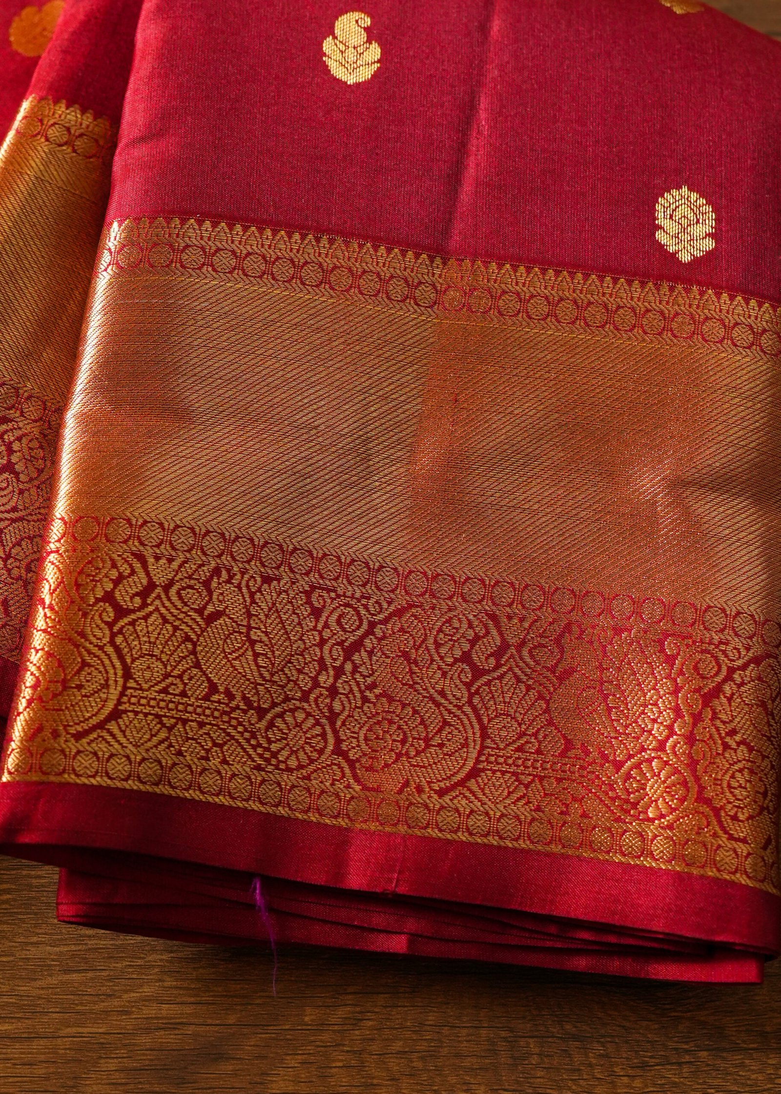 Timeless Tones. Pure Kanchipuram handloom saree crafted with fine silk and elegant 2-gram zari work and traditional border. A perfect blend of tradition, durability, and graceful shine