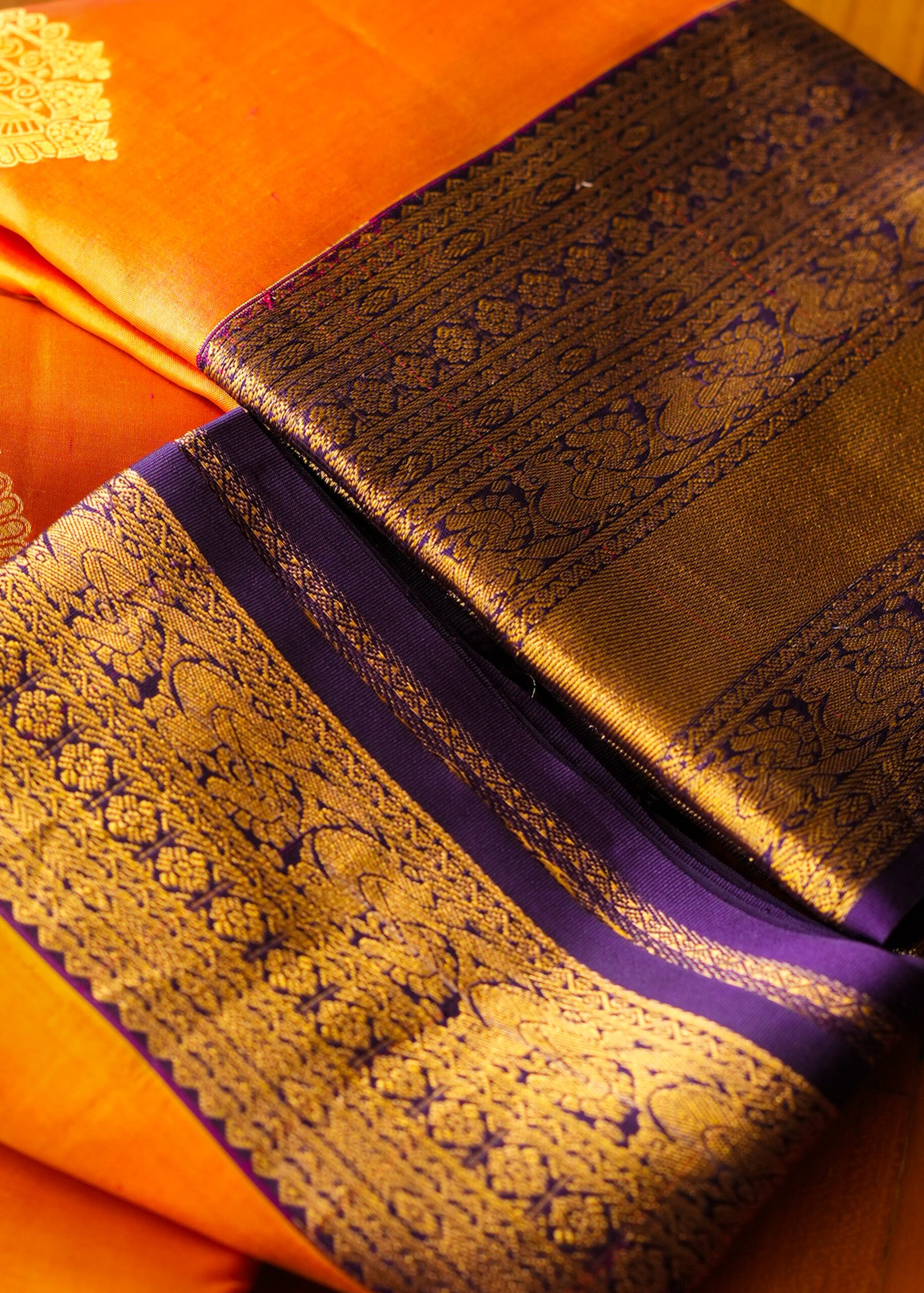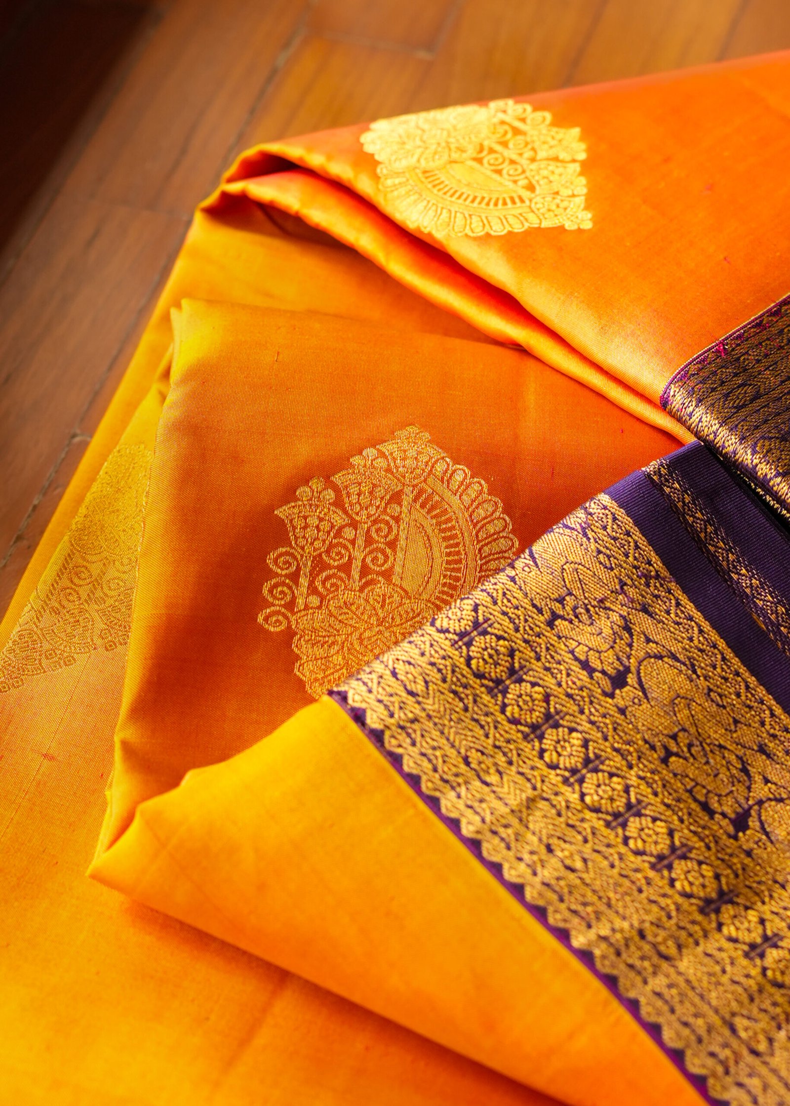 Colors speak louder when they blend right. Pure Kanchipuram handloom saree crafted with fine silk and elegant 2-gram zari work. A perfect blend of tradition, durability, and graceful shine.