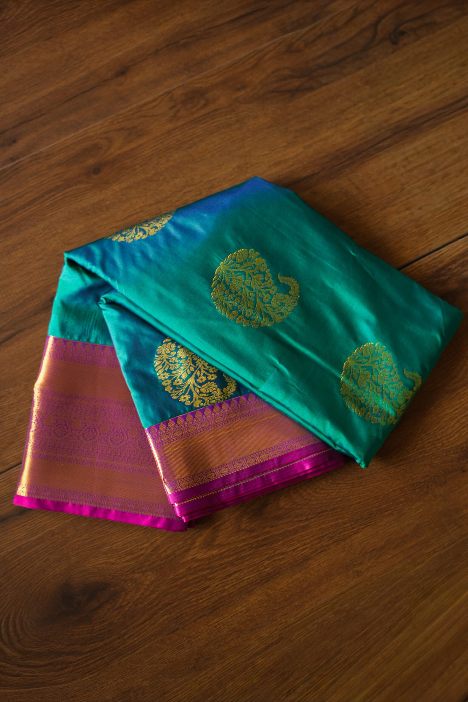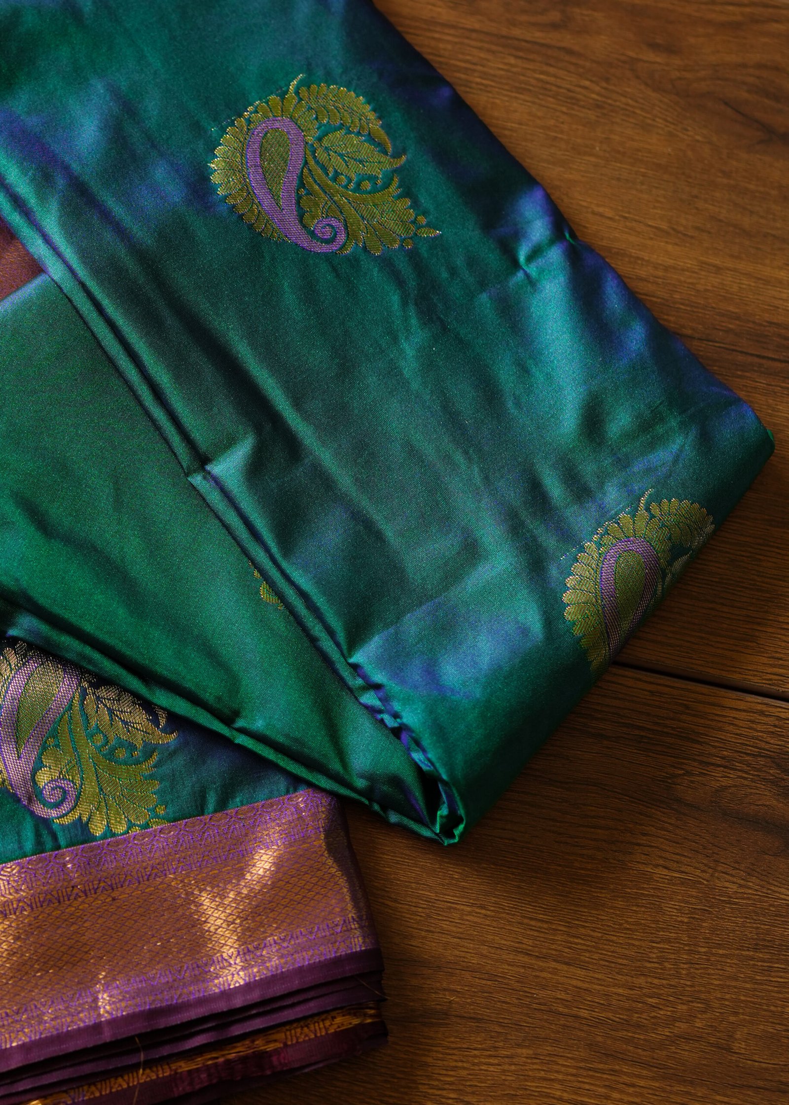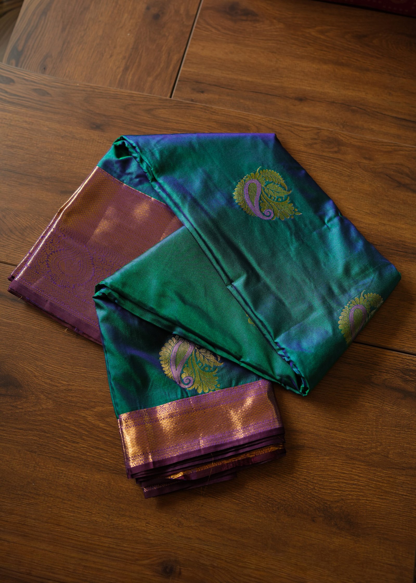 Semi Kanchipuram saree with a full elegent golden motifs, beautifully woven to showcase rich patterns and elegant texture. Crafted for a luxurious look with a lightweight feel, it blends traditional charm with modern comfort
