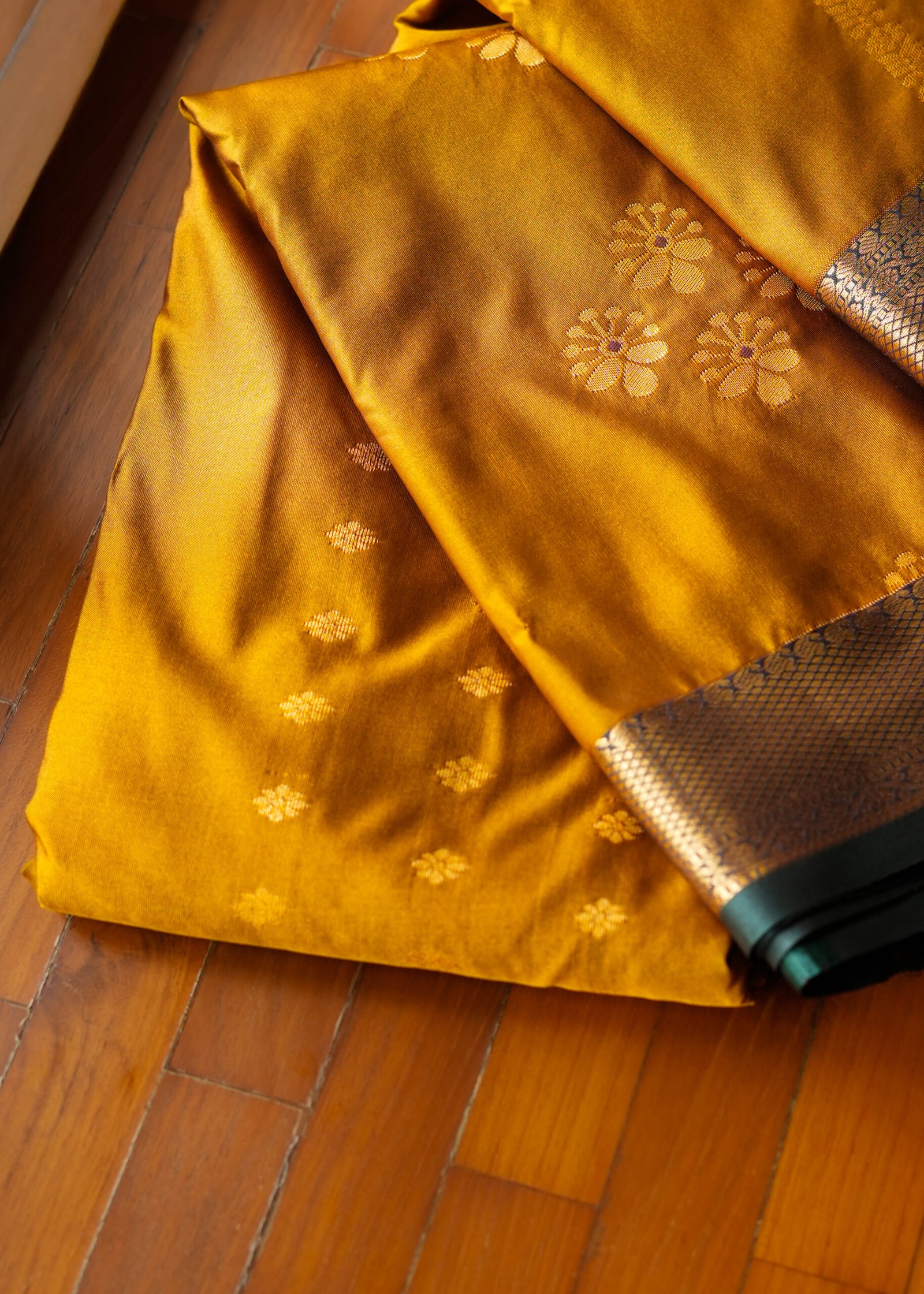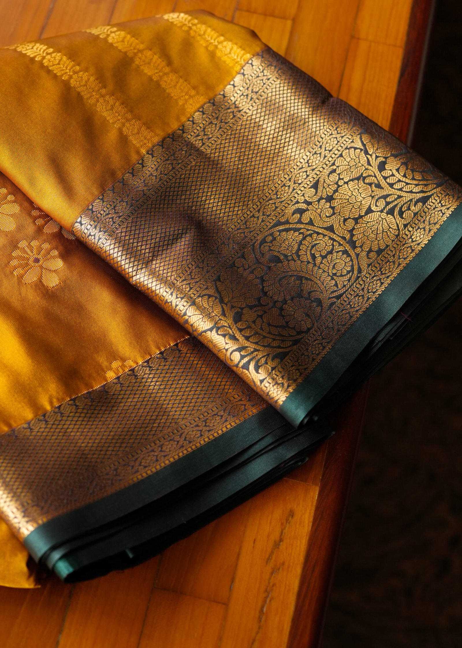 Semi Kanchipuram saree with a full elegent golden stripes, beautifully woven to showcase rich patterns and elegant texture. Crafted for a luxurious look with a lightweight feel, it blends traditional charm with modern comfort