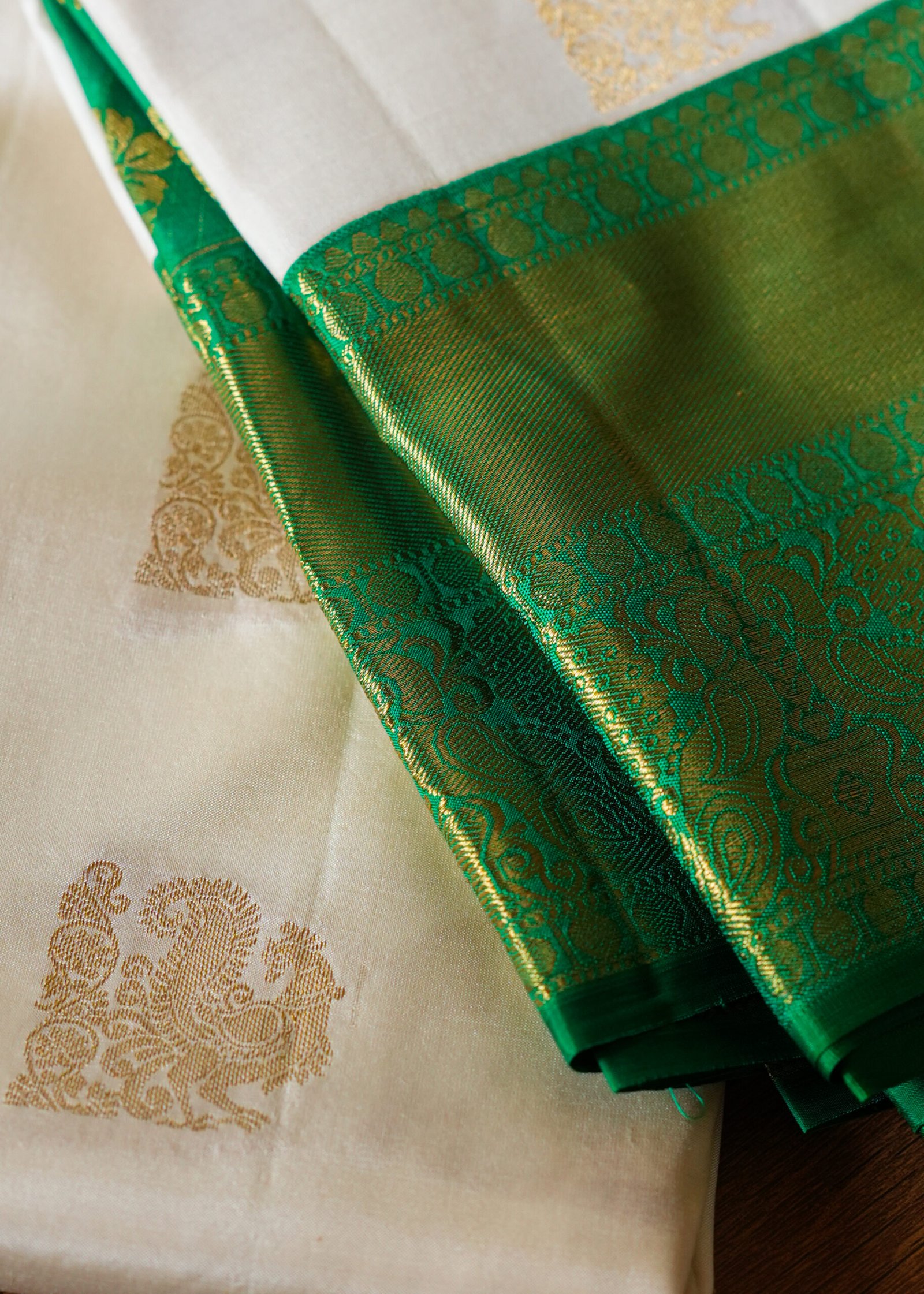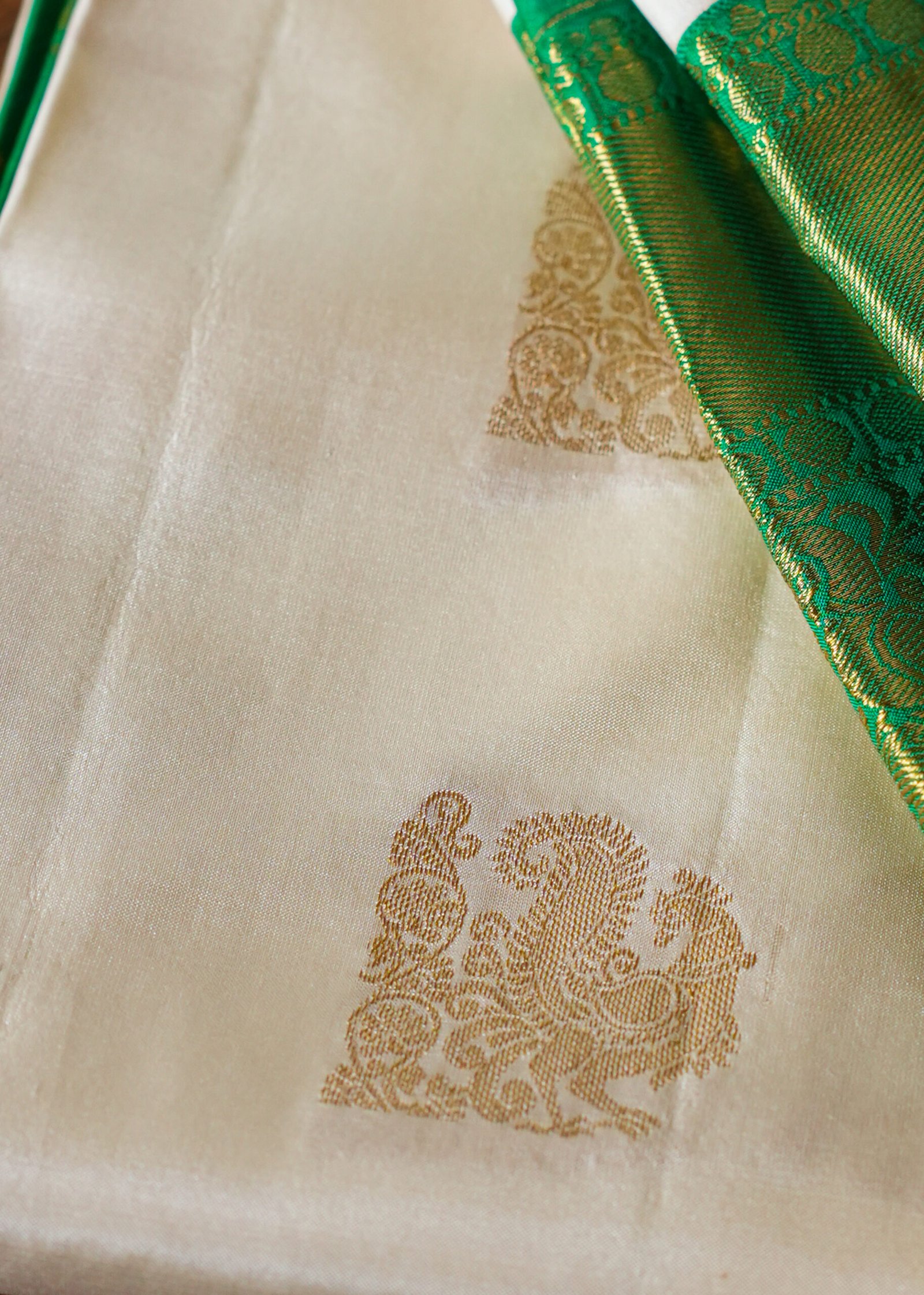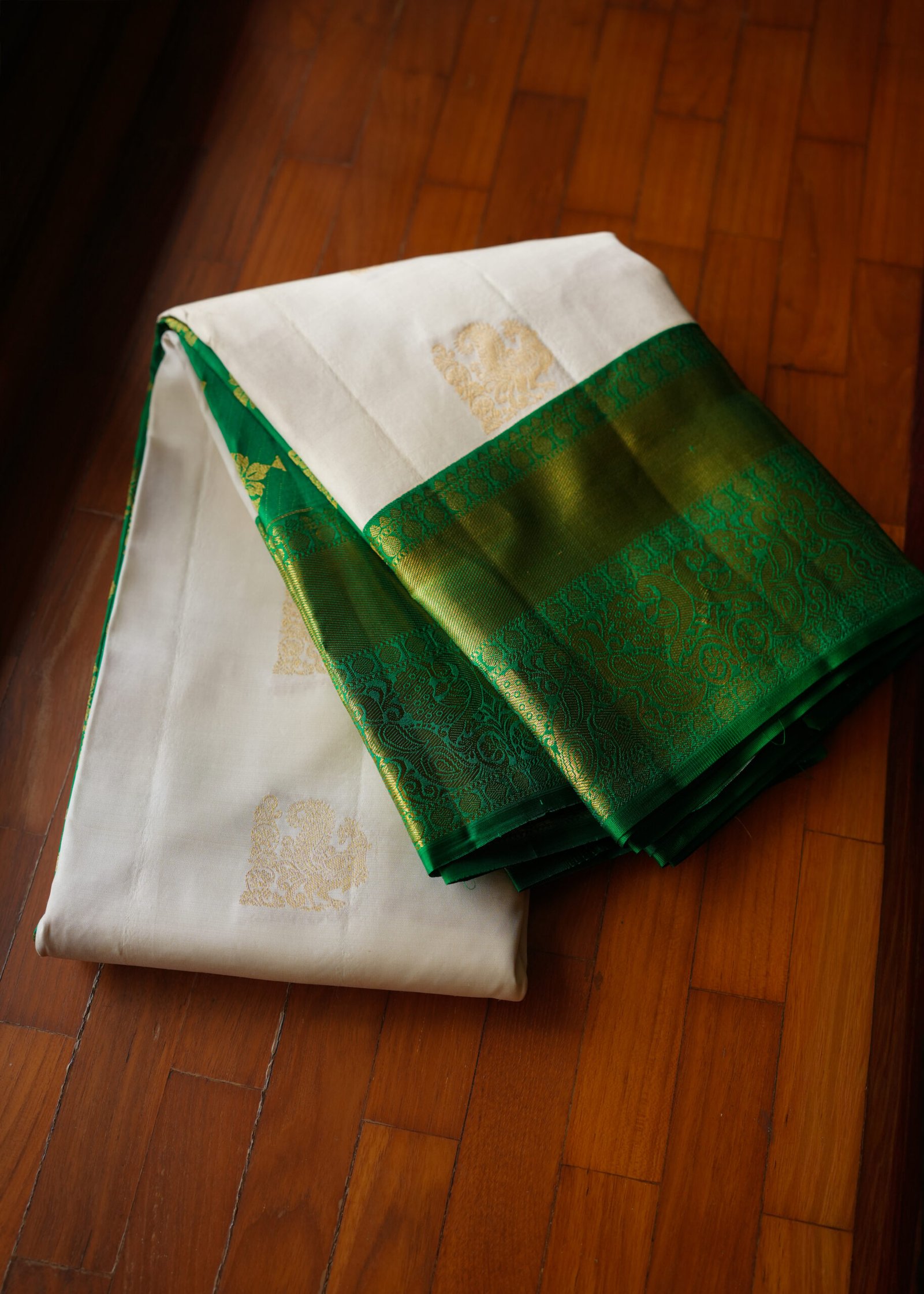 white elegance meets green freshness โ a perfect harmony. Pure Kanchipuram handloom saree crafted with fine silk and elegant 2-gram zari work and traditional border. A perfect blend of tradition, durability, and graceful shine. super combination