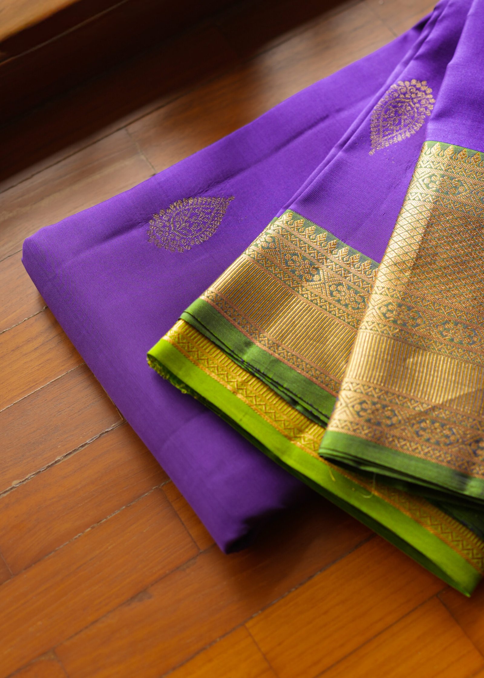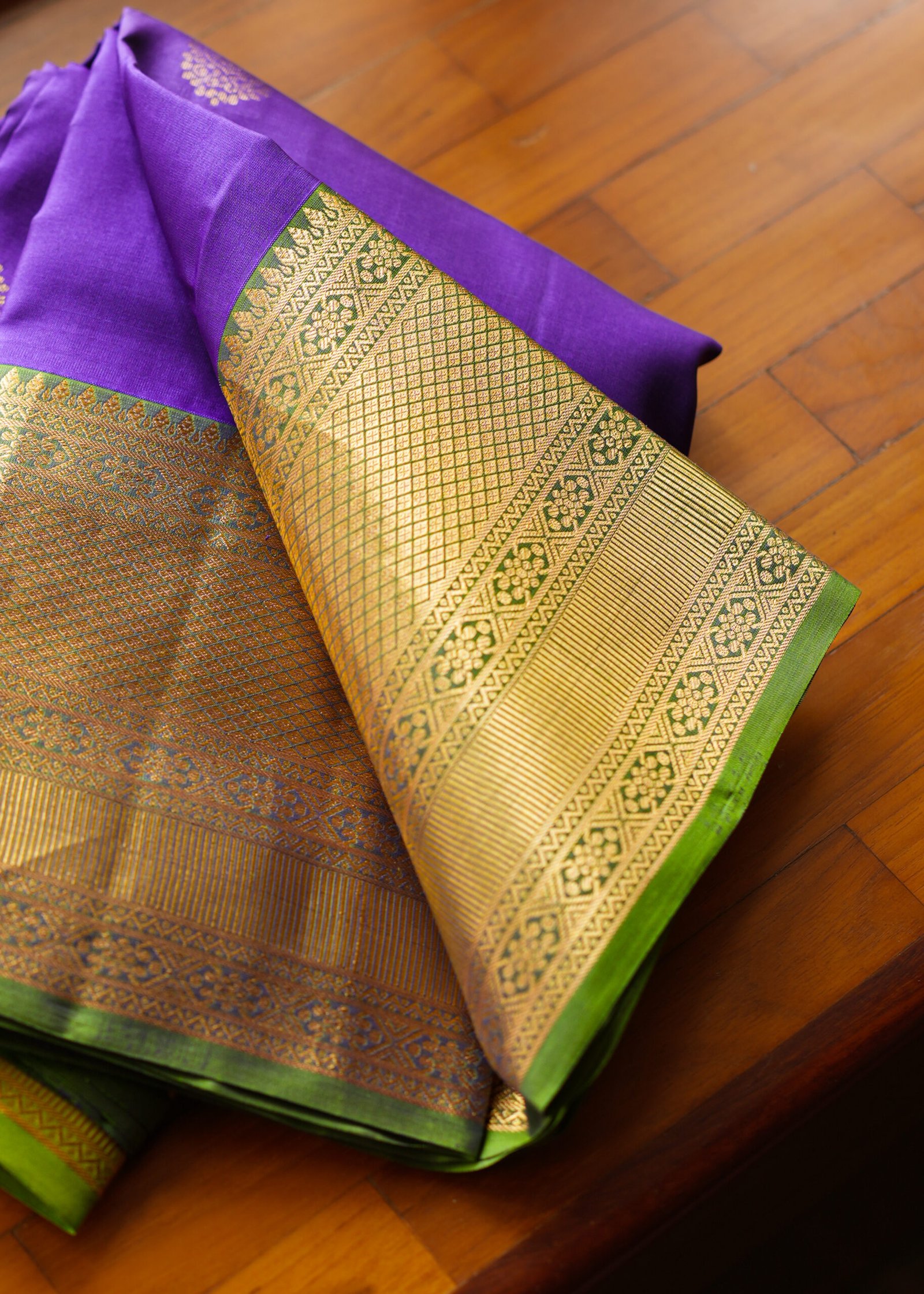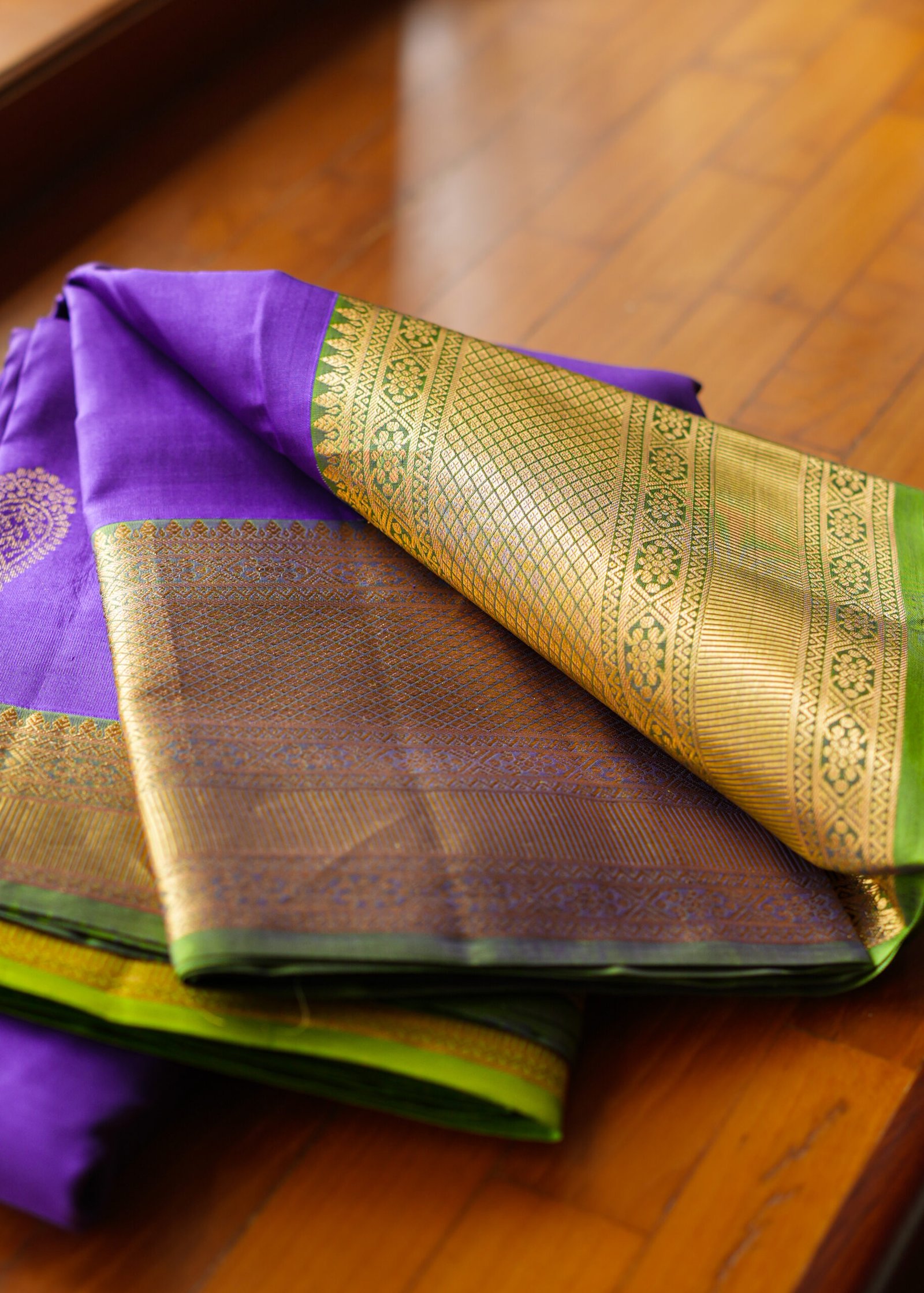 Colors speak louder when they blend right. Pure Kanchipuram handloom saree crafted with fine silk and elegant 2-gram zari work. A perfect blend of tradition, durability, and graceful shine.