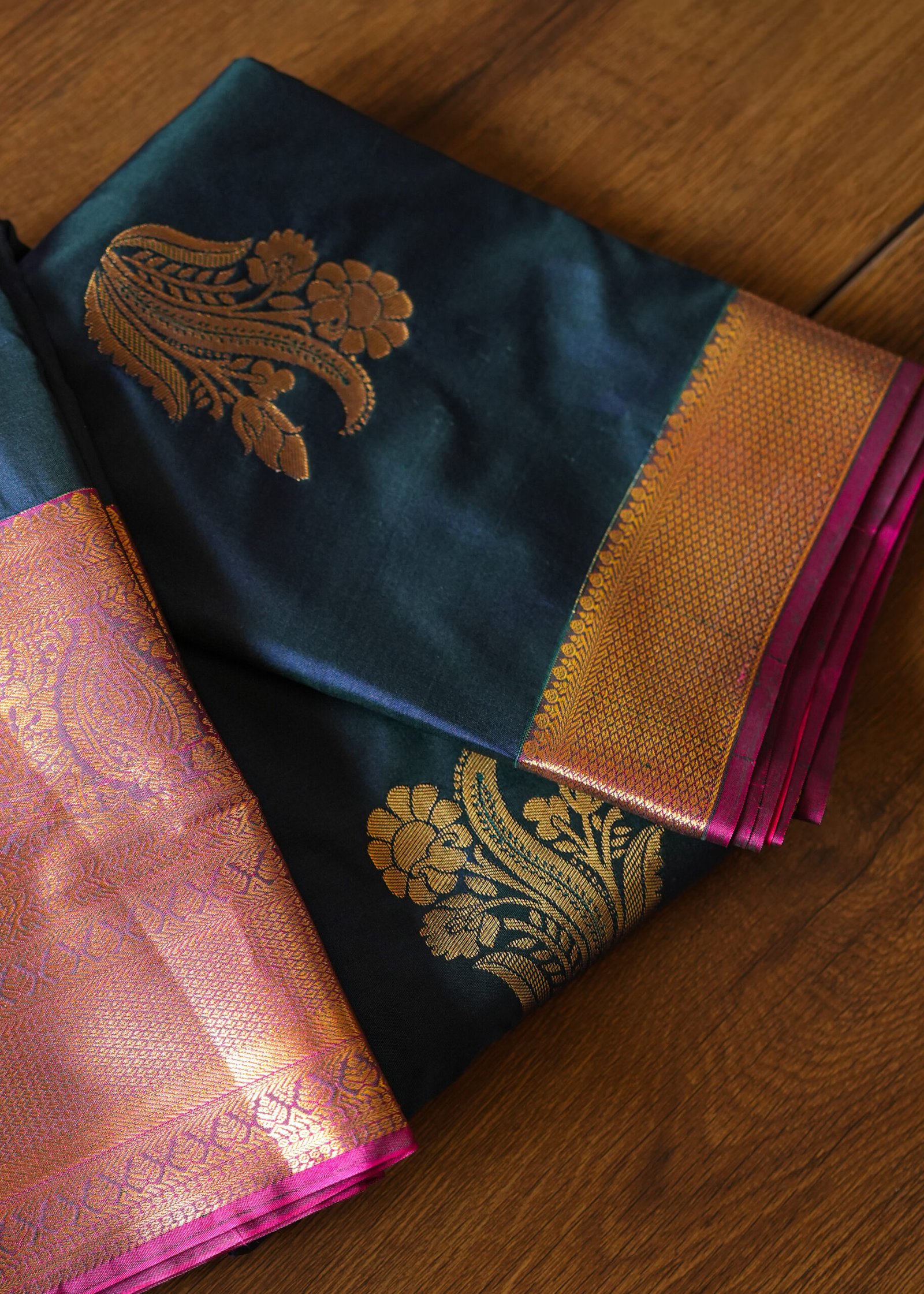Semi Kanchipuram saree with a full elegent golden motifs, beautifully woven to showcase rich patterns and elegant texture. Crafted for a luxurious look with a lightweight feel, it blends traditional charm with modern comfort